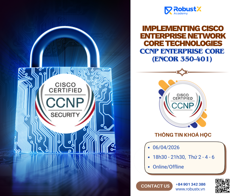 Chương trình đào tạo CCNP Enterprise CORE (ENCOR 350-401) tại RobustX được thiết kế theo chuẩn Cisco với trọng tâm Routing – Switching – Security – Wireless – Automation.