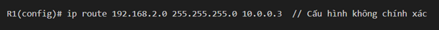 • Kịch bản lỗi: Router R1 (kết nối với R2 qua liên kết 10.0.0.0/30) cần định tuyến đến mạng 192.168.2.0/24 phía sau R2. Giao diện của R2 có địa chỉ IP 10.0.0.2. Tuy nhiên, quản trị viên đã cấu hình nhầm địa chỉ next-hop là 10.0.0.3.
