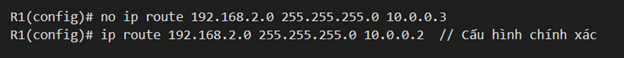 2. Loại bỏ tuyến đường không chính xác và cấu hình lại với địa chỉ next-hop đúng.