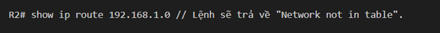 • Kịch bản lỗi: R1 được cấu hình một static route đến mạng 192.168.2.0/24 của R2. Tuy nhiên, trên R2, không tồn tại bất kỳ tuyến đường nào (tĩnh hoặc động) trỏ về mạng 192.168.1.0/24 của R1.