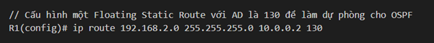 3. Nếu mục tiêu là sử dụng tuyến đường tĩnh làm đường đi dự phòng, hãy cấu hình nó với một chỉ số AD cao hơn chỉ số AD của giao thức động. Kỹ thuật này được gọi là Floating Static Route.