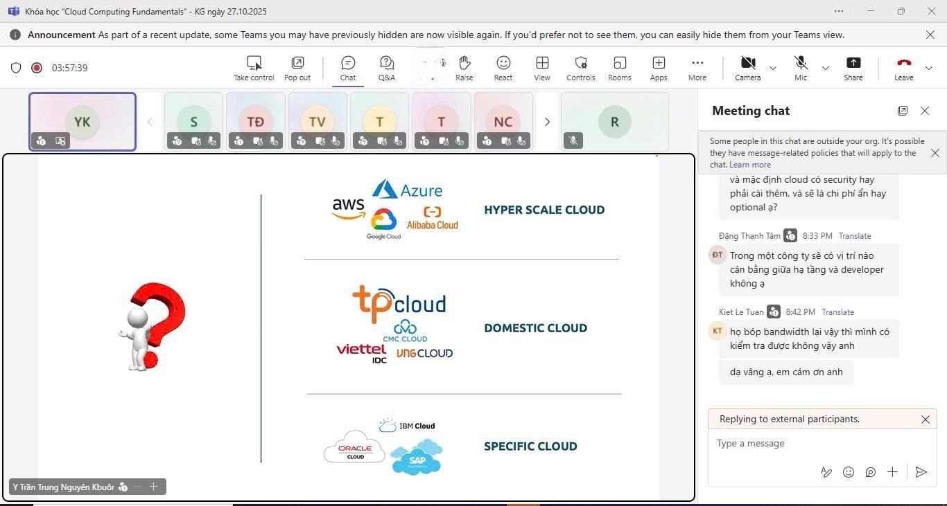 Buổi học đầu tiên diễn ra trực tuyến qua nền tảng Microsoft Teams đã để lại nhiều ấn tượng mạnh mẽ. Hơn 100 học viên đến từ nhiều trường đại học và địa phương khác nhau đã tích cực đặt câu hỏi, trao đổi sôi nổi cùng giảng viên về các xu hướng công nghệ và cơ hội nghề nghiệp trong lĩnh vực điện toán đám mây. Sự năng động, chủ động tìm hiểu và khát khao chinh phục công nghệ mới của thế hệ sinh viên thể hiện rõ tinh thần ham học hỏi và tầm nhìn dài hạn – những yếu tố cốt lõi giúp họ trở thành nguồn nhân lực chất lượng cao trong kỷ nguyên số.