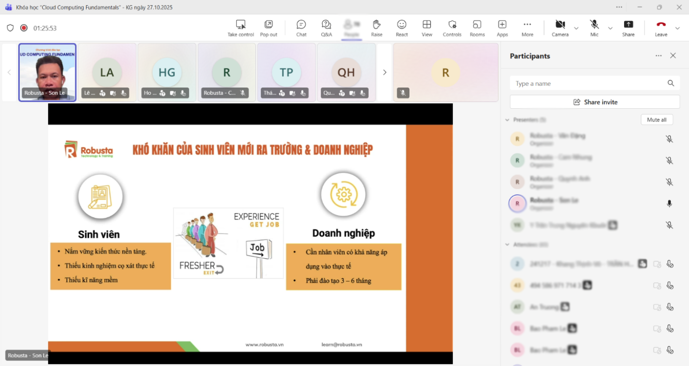 Trong bối cảnh chuyển đổi số đang diễn ra mạnh mẽ trên toàn cầu, điện toán đám mây (Cloud Computing) đã trở thành một trong những nền tảng công nghệ cốt lõi, đóng vai trò trung tâm trong hầu hết các hệ thống CNTT hiện đại. Nhằm trang bị cho sinh viên và người yêu công nghệ Việt Nam nền tảng kiến thức vững chắc về lĩnh vực đầy tiềm năng này, RobustX Academy – Học viện Đào tạo Công nghệ trực thuộc Trung tâm Công nghệ và Đào tạo Robusta – đã chính thức khai giảng khóa học “Điện toán đám mây cơ bản (Cloud Computing Fundamentals)” vào ngày 27/10/2025, thu hút hơn 100 học viên đến từ khắp các tỉnh thành trên cả nước.